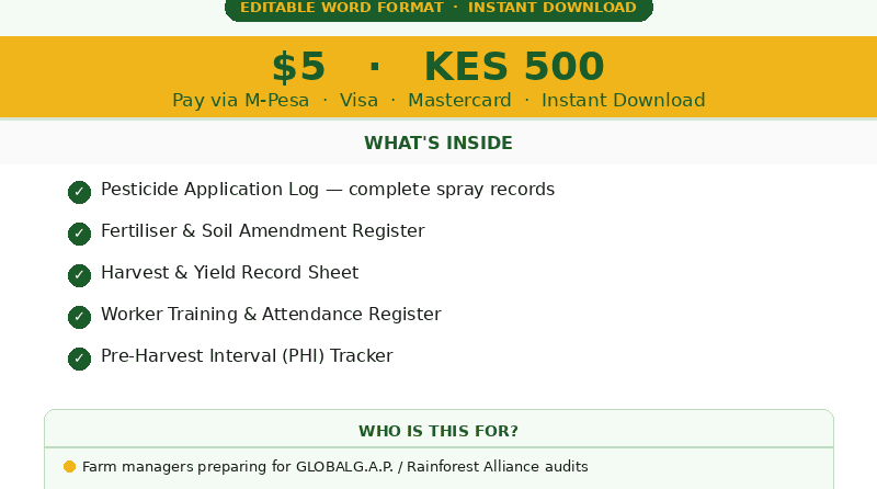 This pack contains 5 ready-to-use, editable templates specifically designed for Kenyan smallholder farmers, cooperatives, and agribusinesses: